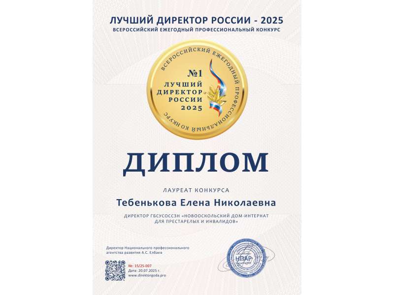 Дипломом Лауреата Всероссийского ежегодного профессионального конкурса "Лучший директор России - 2025" награждена директор Тебенькова Елена Николаевна