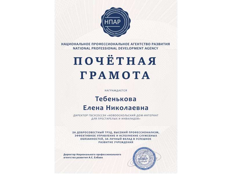 Благодарственное письмо Общероссийской молодежной общественной организации "Ассоциация почетных граждан, наставников и талантливой молодежи" директору дома-интерната Тебеньковой Елене Николаевне