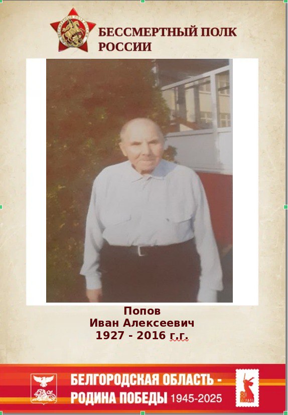 Попов Иван Алексеевич родился 16 октября 1927 г. В х. Два-Дерева, Круглловского района Сталинградской области в семье крестьян. Отец - Попов Алексей Васильевич занимался земледелием. Мать – Попова Анастасия Карповна была домохозяйкой. В 1935 году Иван Алексеевич пошел учиться в Усть-Бузулуцкую среднюю школу, где в 1943 году окончил восемь классов. До призыва в армию работал в колхозе. В ноябре 1944 года Попов И.А. был призван в Советскую Армию по мобилизации. По март 1945 года служил рядовым в 46 – ом запасном стрелковом полку 15-ой стрелковой дивизии. Два брата Ивана Алексеевича погибли во время войны с фашистской Германией. Близких родственников нет. 26 марта по желанию был зачислен курсантом в Краснодарское артиллерийско-минометное училище, которое окончил в сентябре 1947 года и направлен в распоряжение командующего артиллерии войск Дальнего востока. 1953 году уволен в запас по сокращению штатов. Награжден медалью «За Победу над Германией» Указом президиума Верховного Совета ССР от 9 мая 1945 года. Имеет удостоверение «Ветеран труда», «Ветеран участник Великой Отечественной войны». Умер Иван Алексеевич 07.03.2016 года.