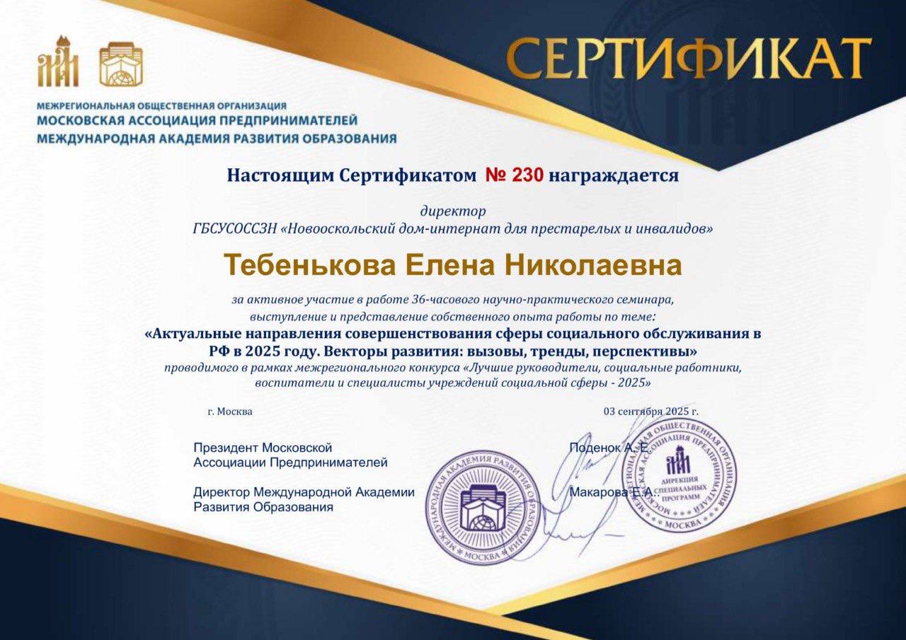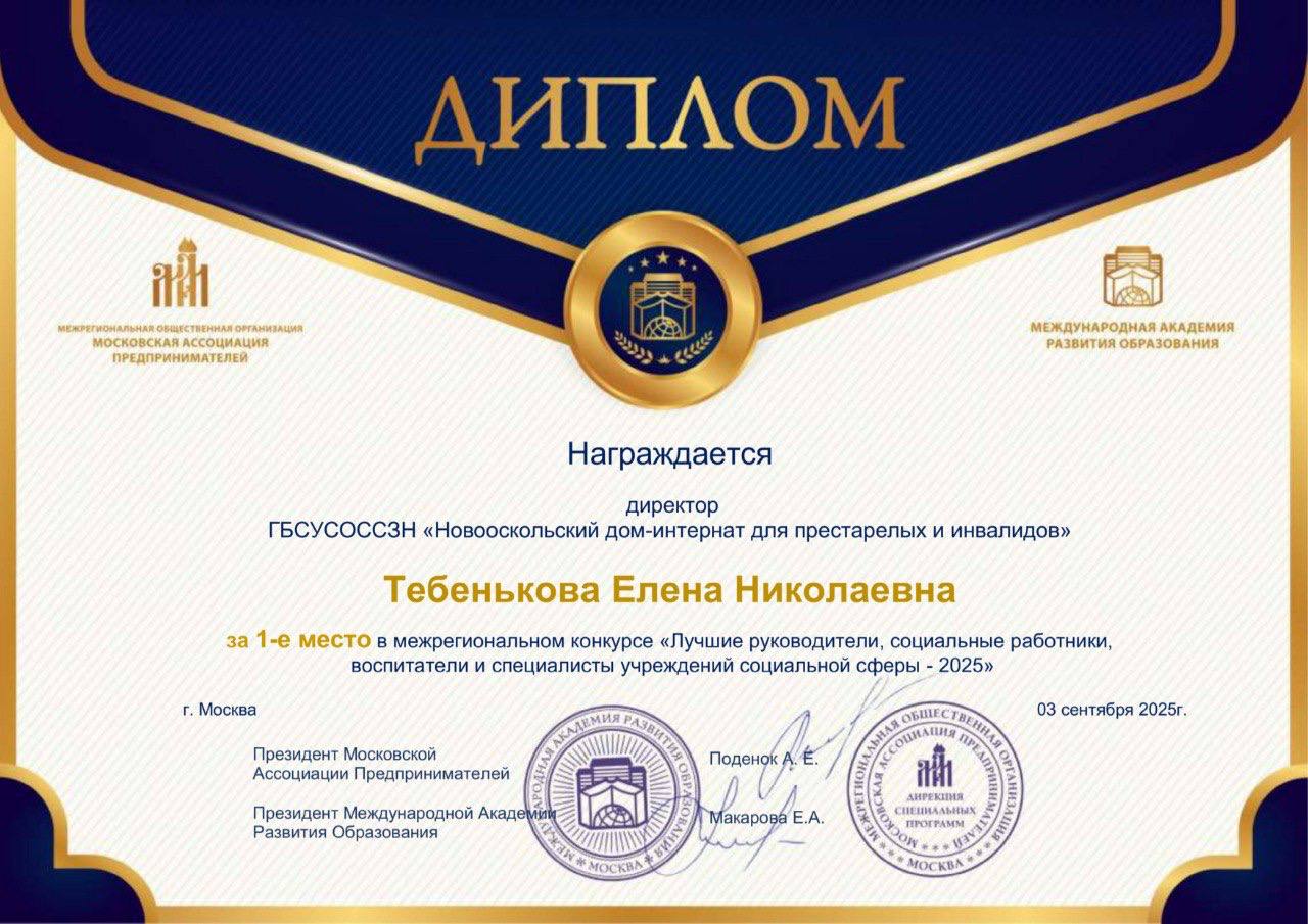 С невероятной радостью сообщаем: Елена Николаевна Тебенькова , директор нашего дома-интерната , стала победителем Конкурса «Лучшие руководители, социальные работники, воспитатели и специалисты учреждений социальной сферы - 2025»!