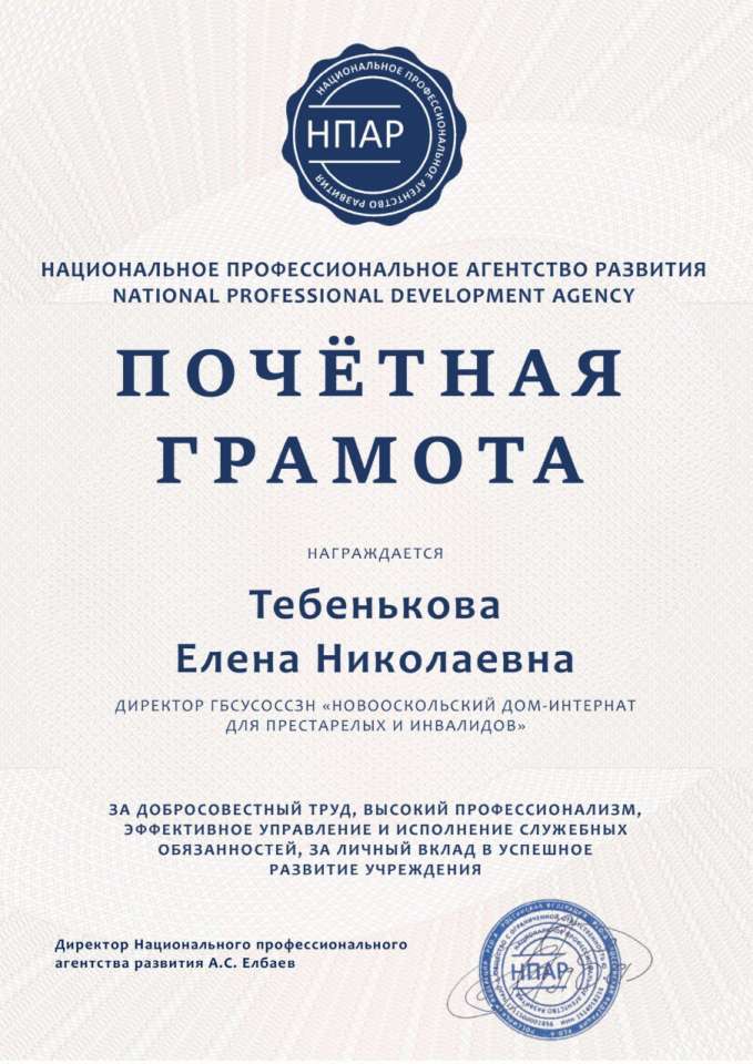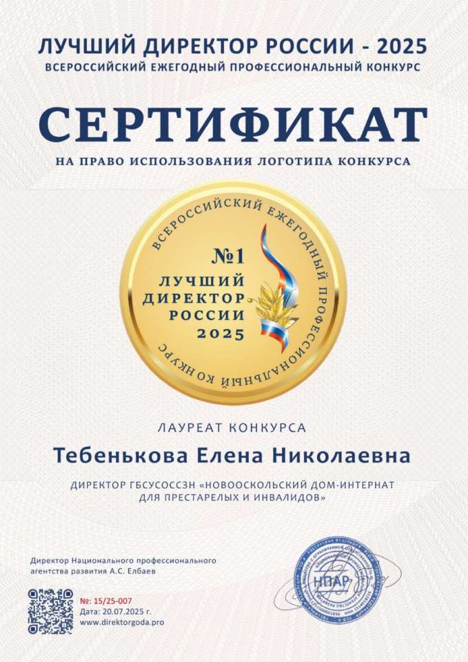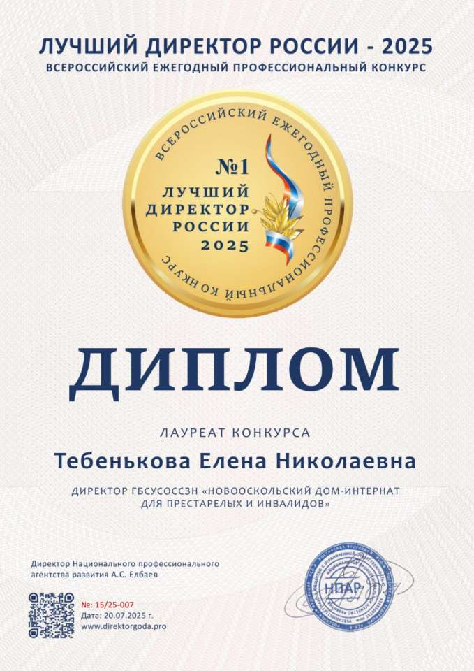 Заслуженная награда Хотим поделиться с вами радостным событием, наш директор, Елена Николаевна Тебенькова, стала лауреатом Всероссийского ежегодного профессионального конкурса "Лучший директор России - 2025"! Эта награда – еще раз подтверждает, профессионализм и преданность делу Елены Николаевны, в развитие социальной сферы и обеспечение достойной жизни жителей нашего учреждения. Под руководством Елены Николаевны, Новооскольский дом-интернат демонстрирует стабильно высокие результаты, внедряя современные методики ухода и создавая по-настоящему домашнюю и заботливую атмосферу. От всей души поздравляем Елену Николаевну и весь наш коллектив! Желаем дальнейших успехов и неиссякаемой энергии #НовооскольскийДомИнтернат #НовыйОскол #ДомИнтернатНовоосколья #Новооскольскийокруг #ЛучшийДиректорРоссии2025 #Награда