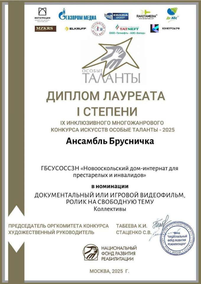 Наш ансамбль "Брусничка" покоряет вершины! Спешим поделиться отличной новостью! Наш ансамбль "Брусничка" принял участие в IX инклюзивном многожанровом конкурсе искусств "Особые таланты - 2025" в номинации "Документальный фильм или видеофильм/ролик на свободную тему" Это не просто награда, это подтверждение упорного труда, безграничной креативности и невероятной силы духа каждого участника ансамбля "Брусничка". Мы гордимся нашими прекрасными артистами, которые показали, что искусство способно объединять и вдохновлять! Поздравляем ансамбль "Брусничка"! Вы – настоящие звезды! #НовооскольскийДомИнтернат #НовыйОскол #ДомИнтернатНовоосколья #Новооскольскийокруг #АнсамбльБрусничка #ОсобыеТаланты2025 #Лауреат1Степени