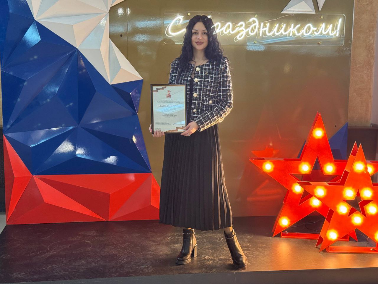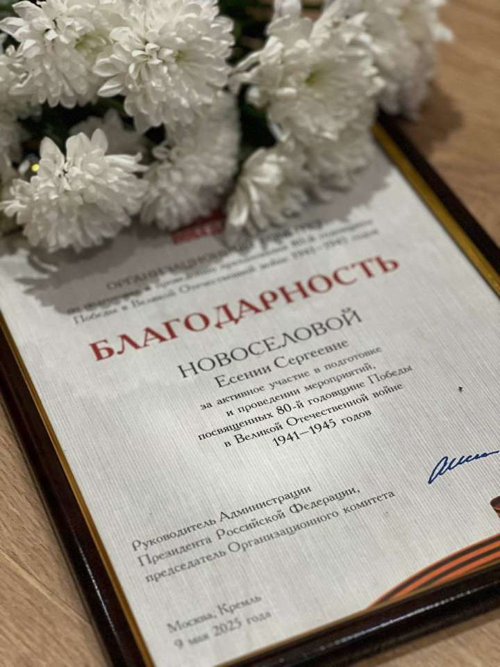Наша сотрудница Новоселова Есения Сергеевна была отмечена Благодарностью руководителя Администрации Президента РФ А.Вайно, за активное участие в подготовке и проведении мероприятий, посвящённых 80-й годовщине Победы в Великой Отечественной войне 1941-1945 годов.