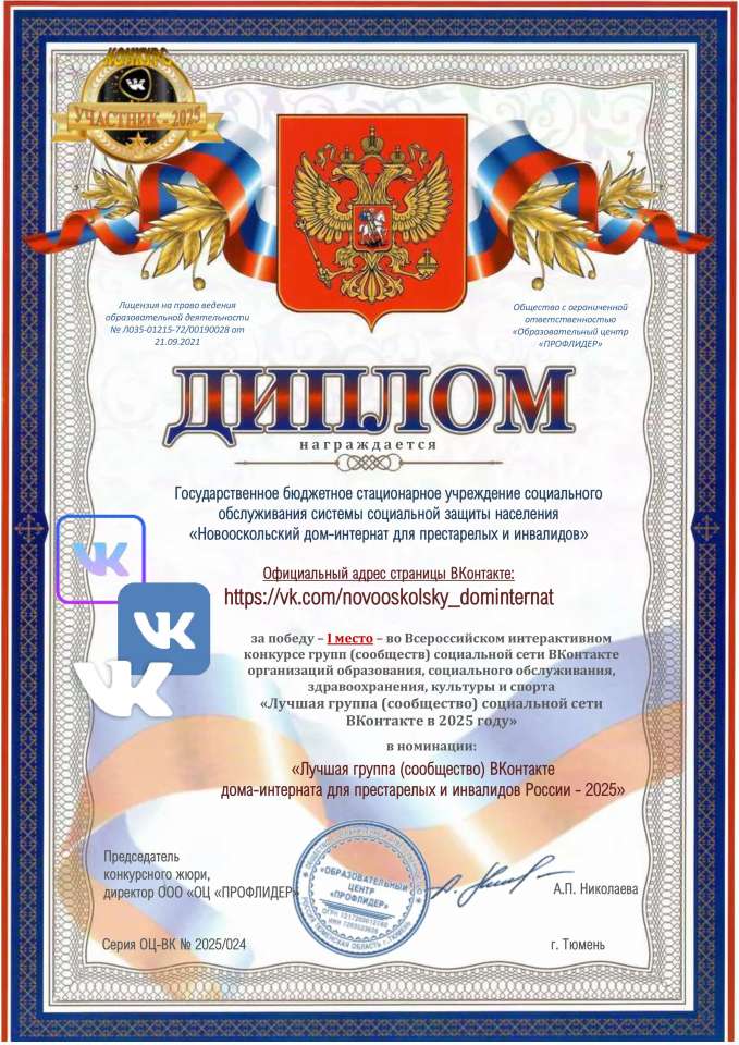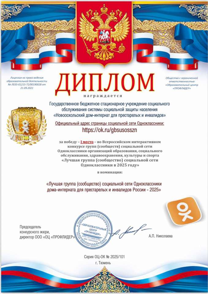 Это невероятное достижение – мы стали победителями сразу в двух социальных сетях – ВКонтакте и Одноклассники! С гордостью сообщаем: группа социальных сетей Новооскольского дома-интерната для престарелых и инвалидов заняла 1 место во Всероссийском конкурсе «Лучшая группа (сообщество) социальной сети ВКонтакте и Одноклассники в 2025 году» среди организаций образования, социального обслуживания, здравоохранения, культуры и спорта! Эта победа – заслуженное признание нашей общей работы: Спасибо, что вы с нами дорогие подписчики! Ваша поддержка вдохновляет нас. Без вас эта победа была бы невозможна! Мы продолжим радовать вас интересными новостями и развивать наше сообщество, стремясь к новым вершинам! #НовооскольскийДомИнтернат #НовыйОскол #ДомИнтернатНовоосколья #Новооскольскийокруг #ЗаботаОпожилых #лучшаягруппа #ВКонтакте