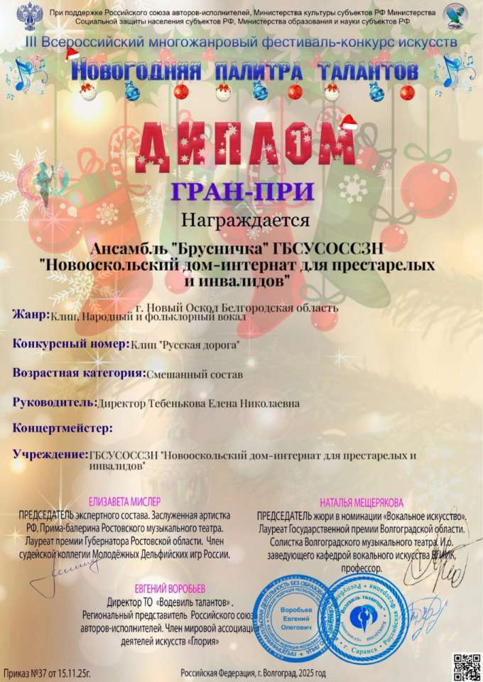 "Брусничка" сияет на "Новогодней палитре талантов" У нас потрясающая новость, которой мы спешим поделиться! Наш ансамбль "Брусничка" стал обладателем Диплома Гран-при на III Всероссийском многожанровом фестивале-конкурсе искусств "Новогодняя палитра талантов"! Это невероятное достижение стало возможным благодаря нашему яркому и душевному клипу "Русская дорога"! Мы вложили в него всю свою энергию, талант и любовь к родному краю. Этот диплом – не просто награда, а стимул двигаться дальше, развиваться и радовать вас новыми яркими выступлениями. Мы гордимся тем, что представляем нашу культуру и традиции, и будем продолжать делать это с еще большим энтузиазмом! #НовооскольскийДомИнтернат #НовыйОскол #ДомИнтернатНовоосколья #Новооскольскийокруг #ЗаботаОпожилых #АнсамбльБрусничка #РусскаяДорога