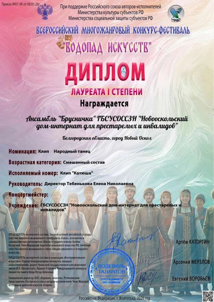 Наш талантливый ансамбль «Брусничка» на Всероссийском многожанровом конкурсе-фестивале «Водопад искусств» одержал блестящую победу, став Лауреатом I степени ! «Брусничка» представила поистине завораживающий и проникновенный видеоклип на легендарную песню «Катюша». Пусть эта победа станет лишь первым шагом на пути к новым, ещё более ярким творческим вершинам и впечатляющим достижениям! #НовооскольскийДомИнтернат #НовыйОскол #ДомИнтернатНовоосколья #Новооскольскийокруг #ЗаботаОпожилых #ВодопадИскусств #Победа #Лауреат1Степени #Конкурс #Фестиваль